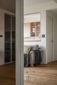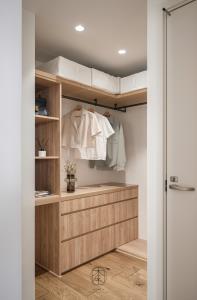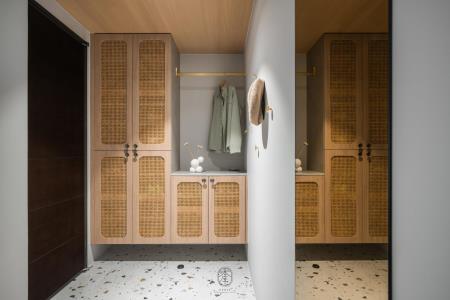 穿過玄關的轉折,大片百葉窗導入自然光,